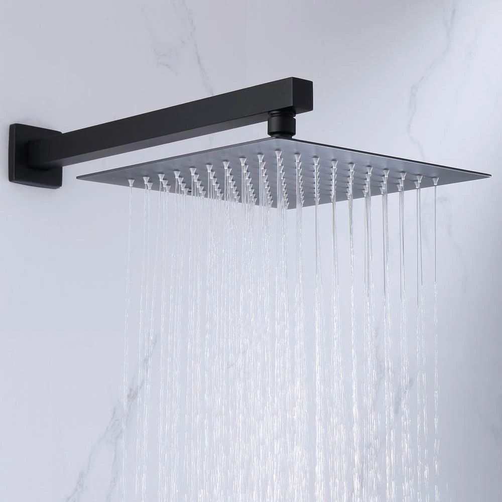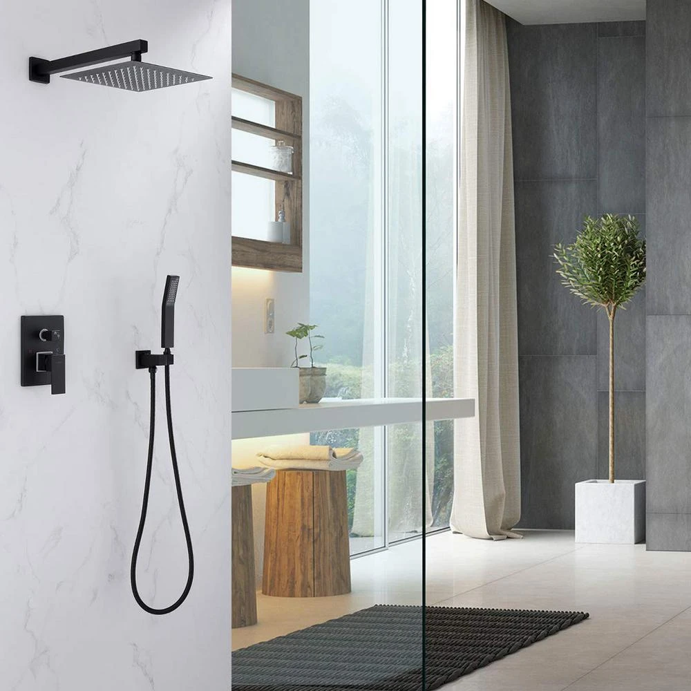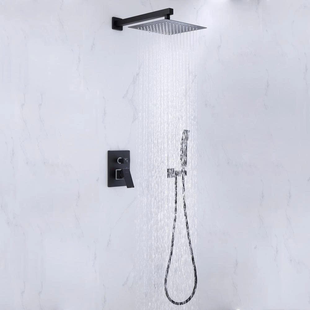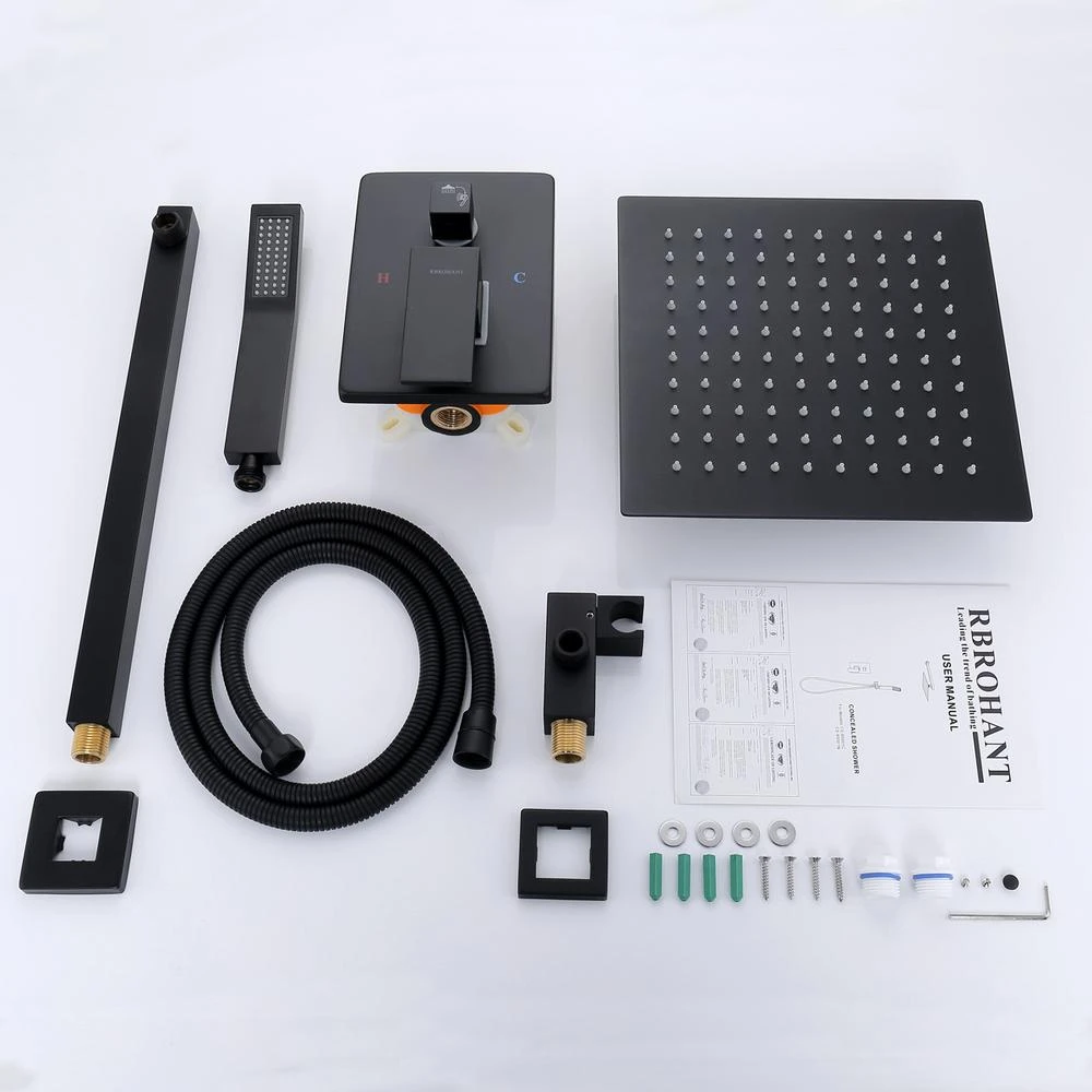 - Includes: 10 in. rotatable square rain shower head (304 stainless steel), handheld shower head (all brass), shower faucet valve (all brass), 15.7 in. shower head arm (all brass), 60 in. shower hose (stainless steel and 2 functions concealed mixer valve
