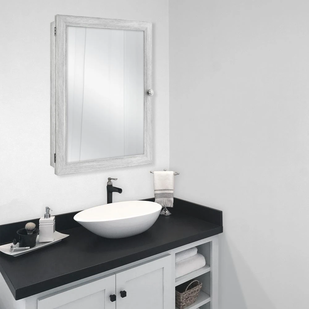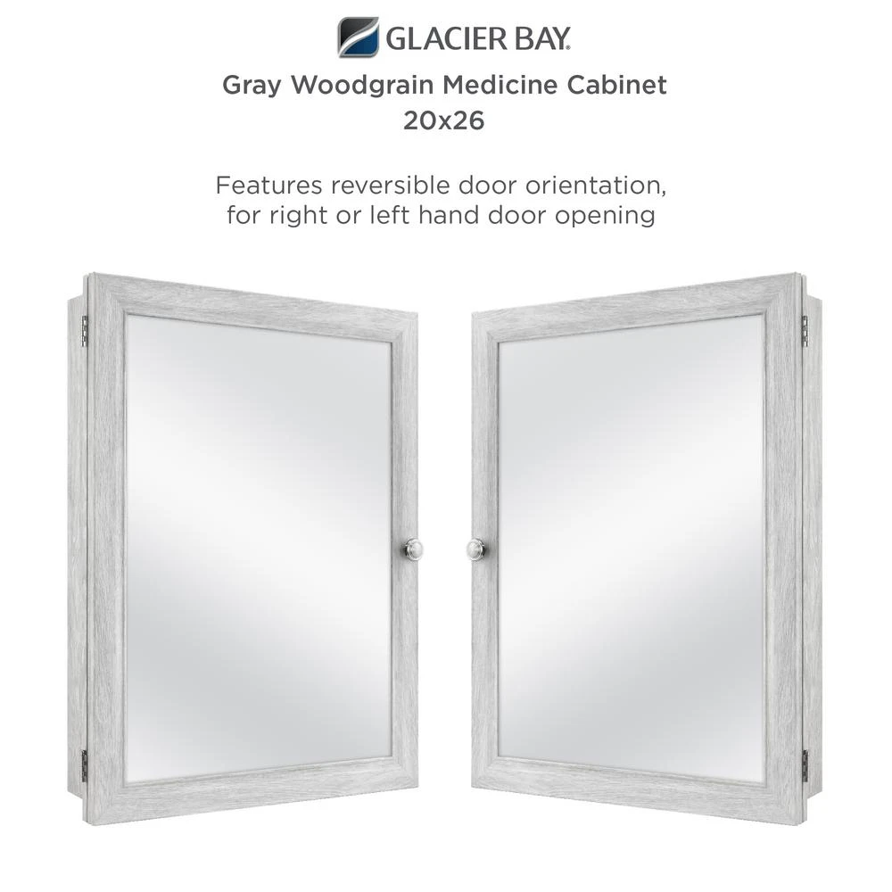 A perfect complement to any bathroom style, the Glacier Bay 20 in. W x 26 in. W x 4.64 in. D Beveled Frameless Medicine Cabinet features a stylist pewter finish. The polystyrene cabinet and frame is lightweight, durable and resistant against mold and mildew. This medicine cabinet can be recessed or surface mounted. Includes double shelf pegs and 2 adjustable shelves that allow for quick and easy customized storage space. The versatility of this cabinet also allows the door to be reversible to open left or right based on your preference and door opens to 140°. The grey woodgrain finish can easily coordinate with any existing bathroom hardware.