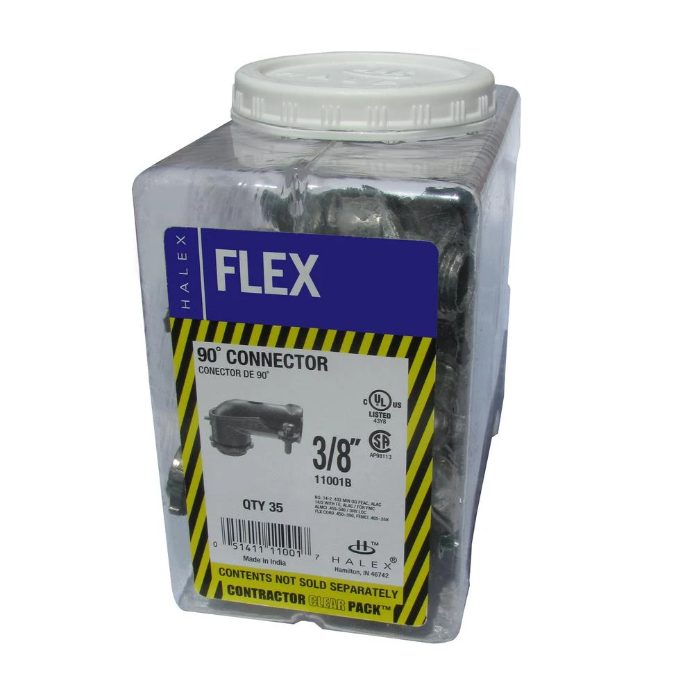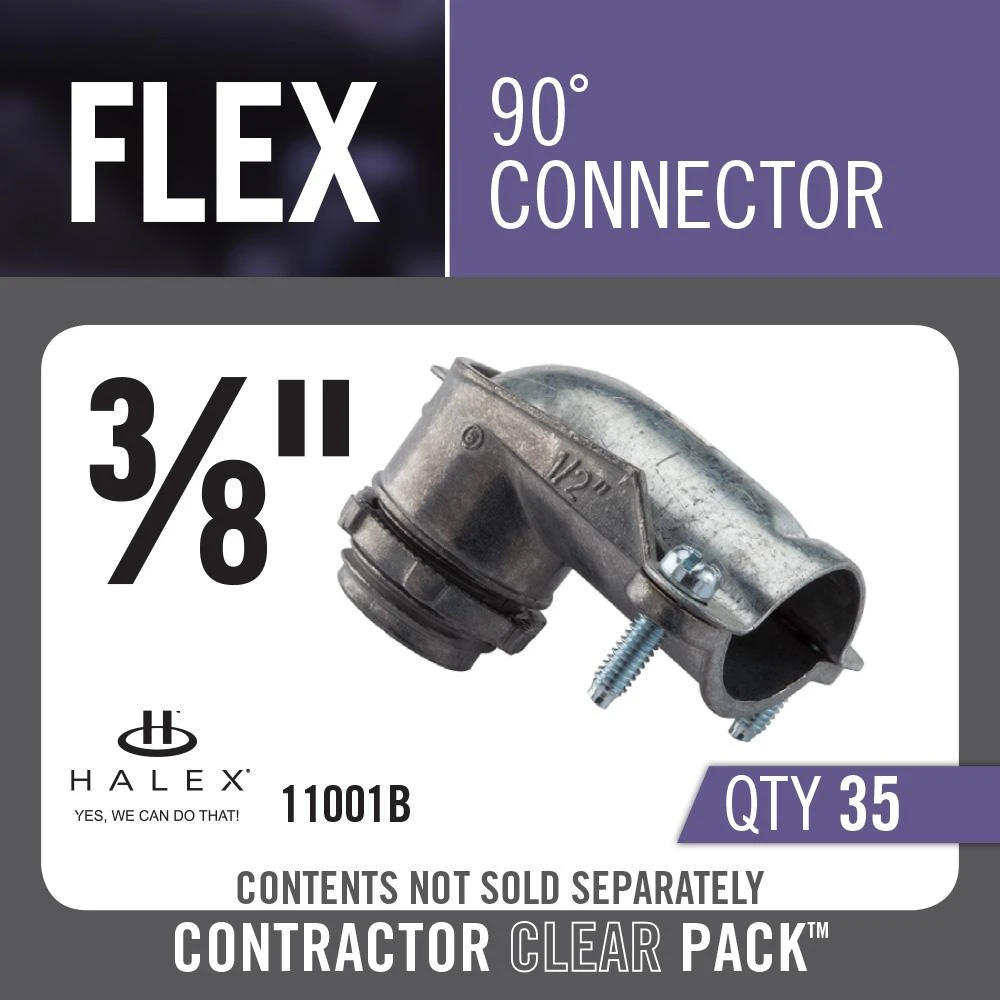 These 3/8 in. 90° Flexible Metal Conduit (FMC) Connectors (35-Pack) connect and bond FMC to steel outlet boxes and other metal enclosures. They are designed with a reversible locknut. They cut through protective coatings to establish ground continuity.