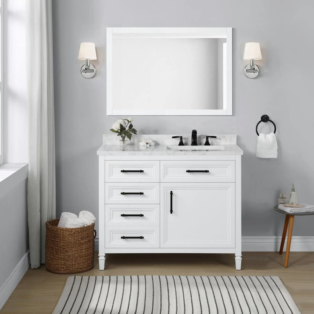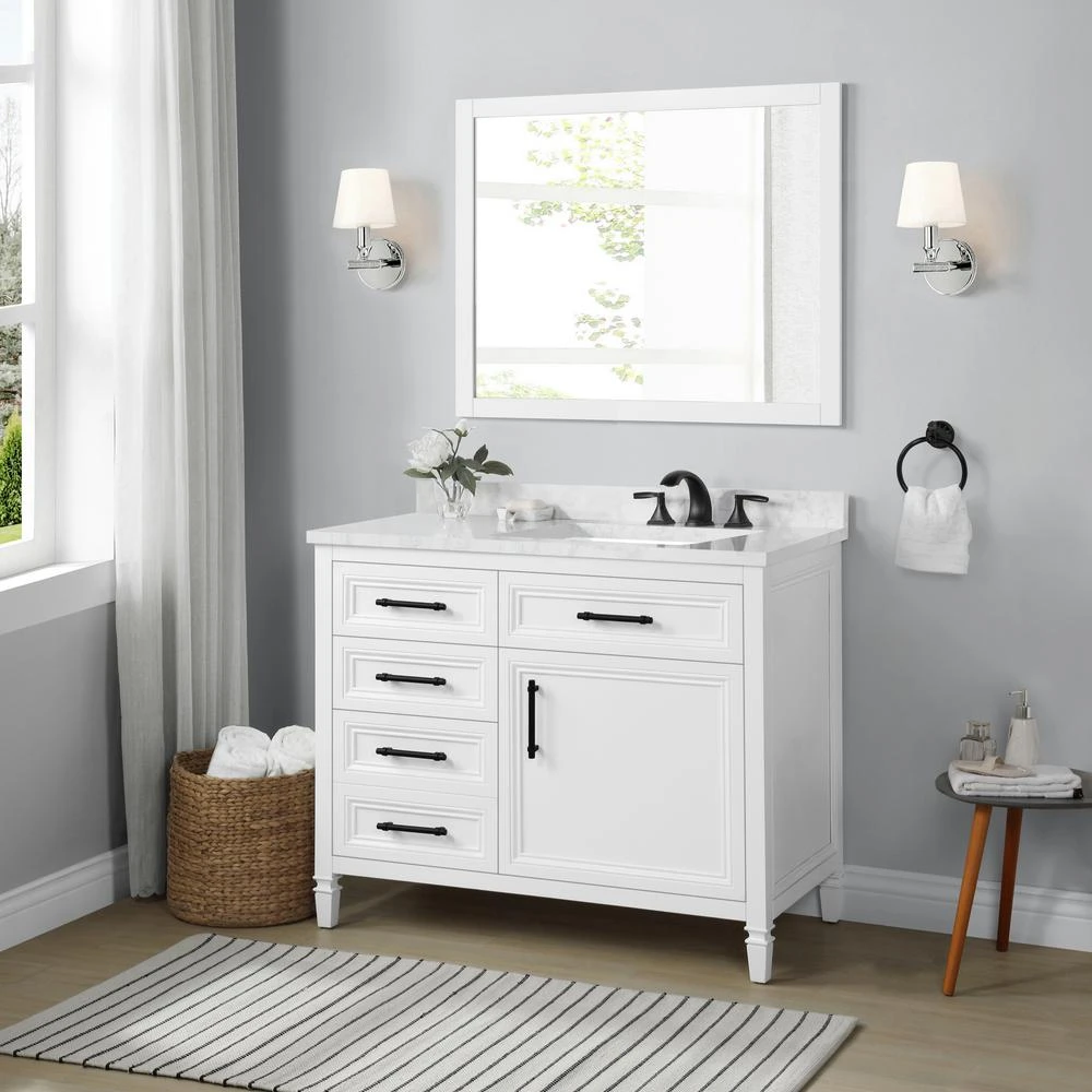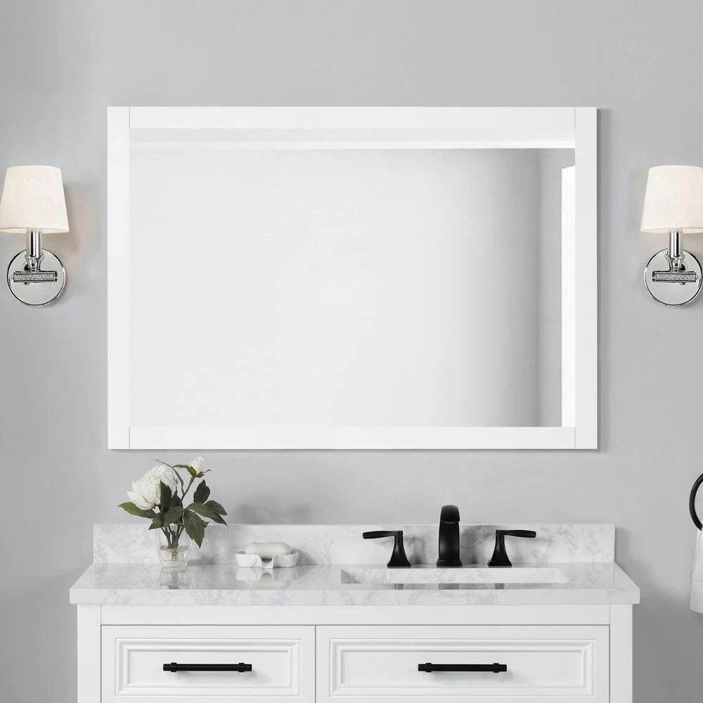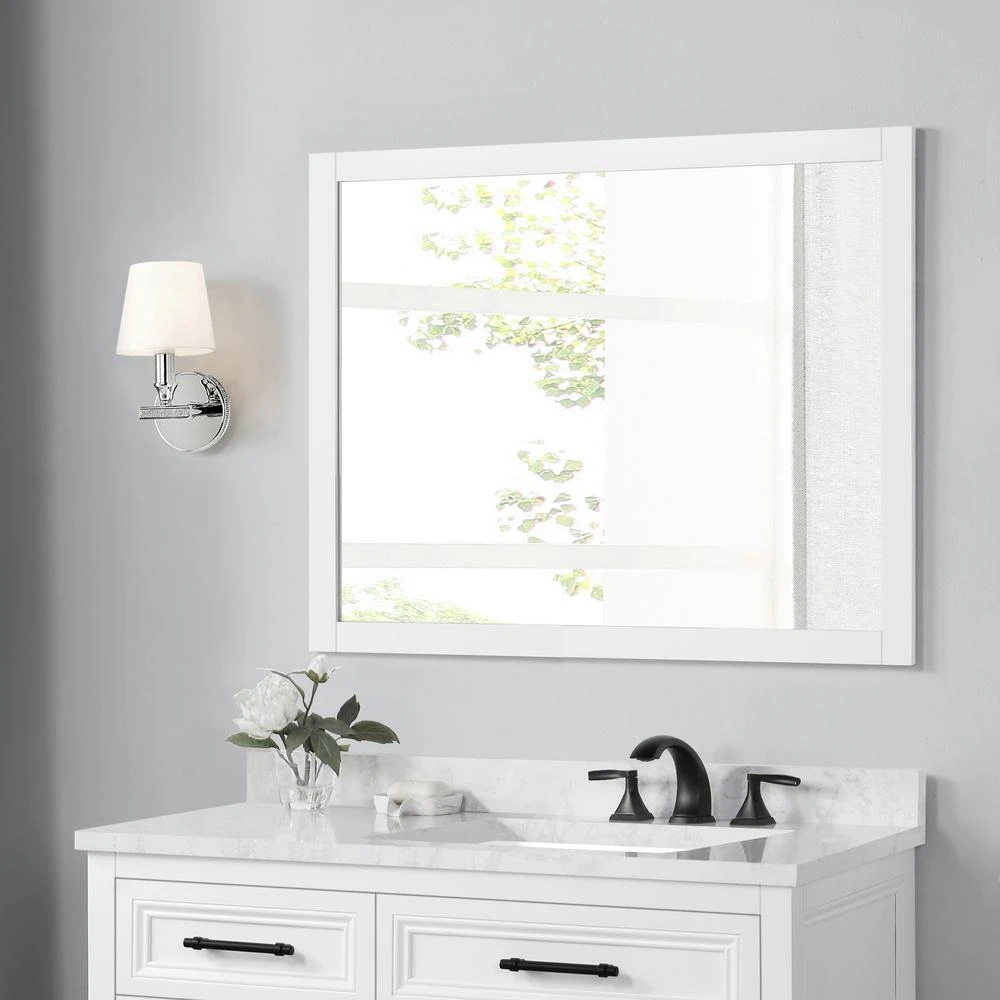 Feel like a Hollywood star every morning with the Marilyn 40 in. wide by 28 in. high bathroom vanity mirror by Home Decorators Collection. This graciously framed mirror in an attractive modern white finish is the ideal finishing touch to the Marilyn bathroom vanity collection, which includes a 42 in. wide right offset sink option plus a large 60 in. wide double vanity, all with clever storage features and gorgeous cultured marble tops.