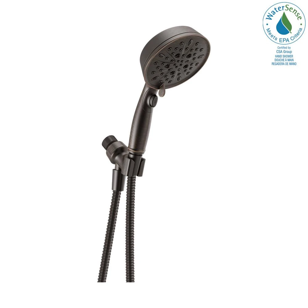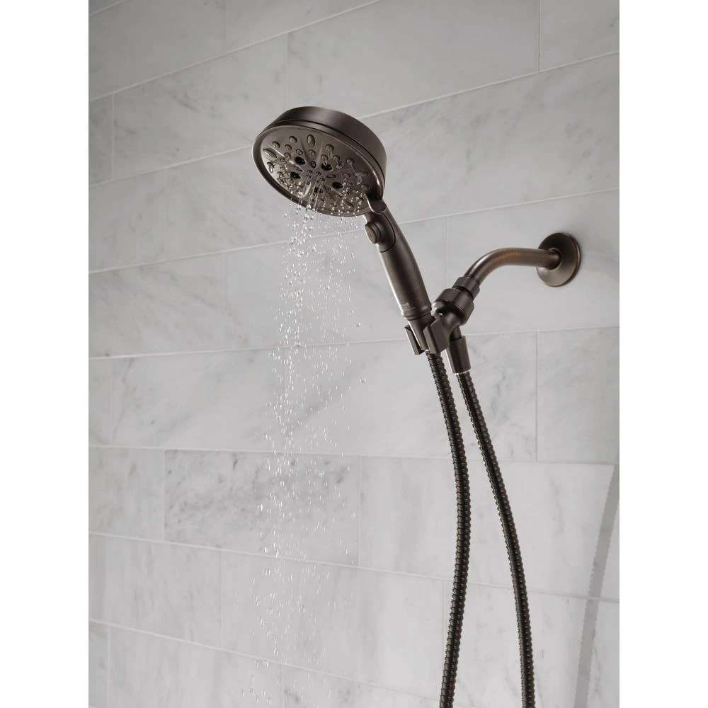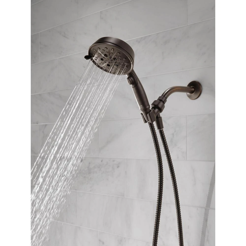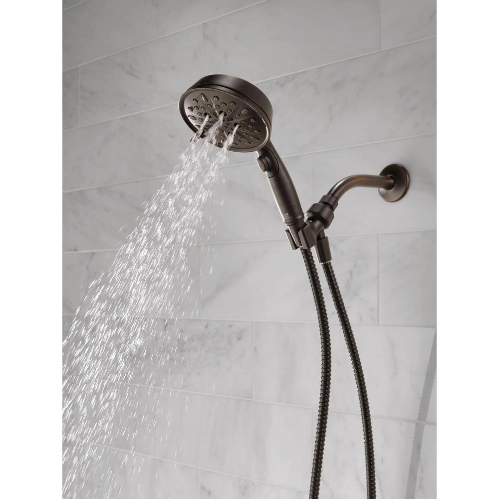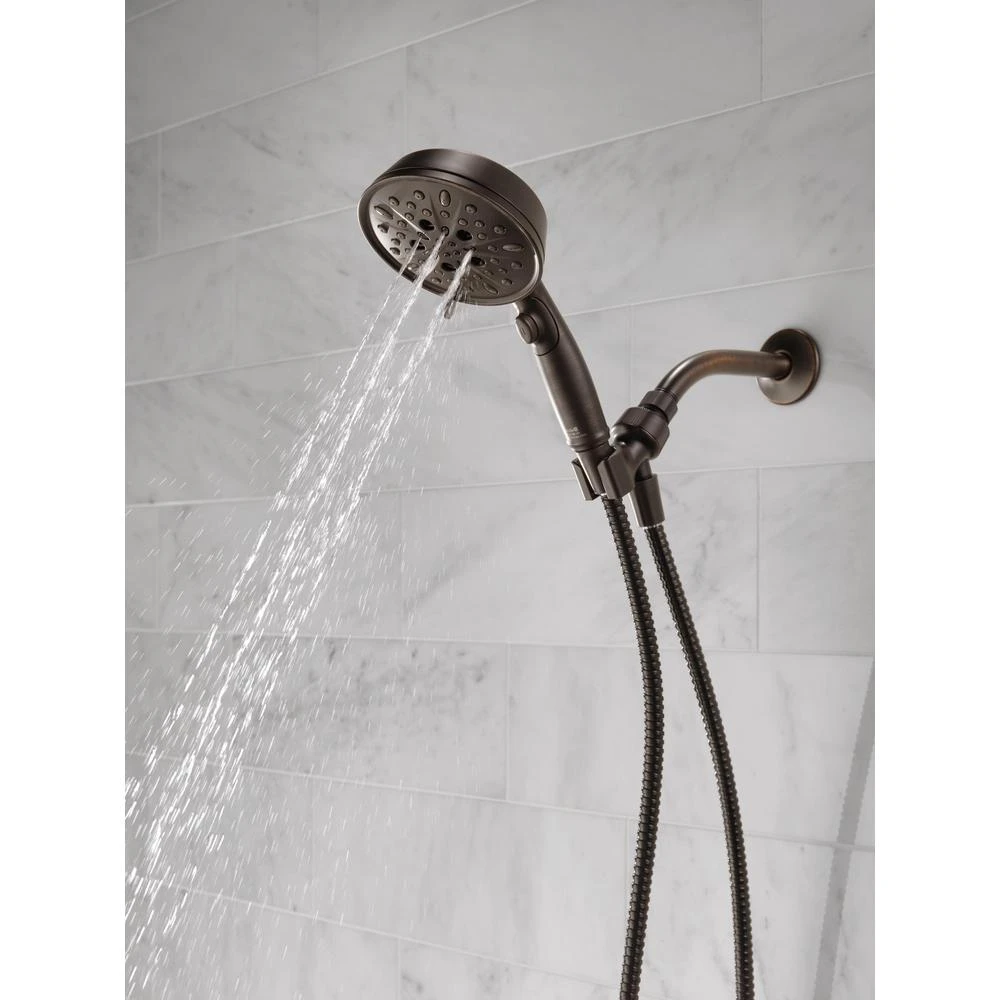Delta H2Okinetic PowerDrench Showers look different because they are different. H2Okinetic showers are powered by an innovative technology that sculpts the water into a unique wave pattern, giving you the feeling of more water without using more water and creating a shower with more warmth, coverage and intensity. So go ahead and indulge, because now you can enjoy the feeling of more water without using more water. Delta SpotShield Technology helps to keep your faucet or shower cleaner, longer by resisting water spots and fingerprints. Keep your space spotless with SpotShield Technology, available across a variety of finishes for the kitchen and bath. While other products may gather unsightly mineral build-up over time, Delta soft rubber Touch-Clean spray holes allow any mineral residue to simply be wiped away for an instantly refreshed look with no need for soaking or the aid of chemical cleaners. The pause setting gives you ample space for shaving, lathering and other shower tasks, without worrying about overspray or water waste. This spray setting helps you conserve water, so you can worry less about depleting your supply of hot water – and you help the environment too. Delta WaterSense labeled faucets, showers and toilets use at least 20% less water than the industry standard saving you money without compromising performance.