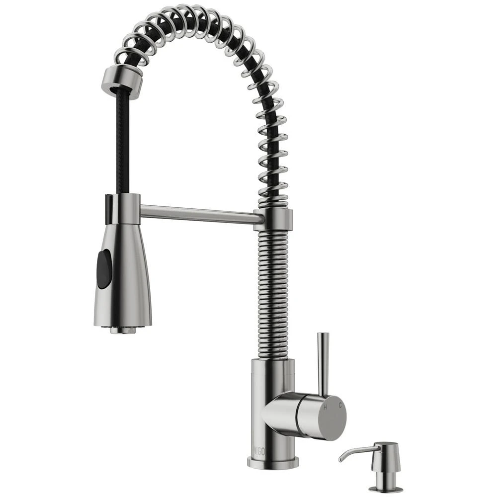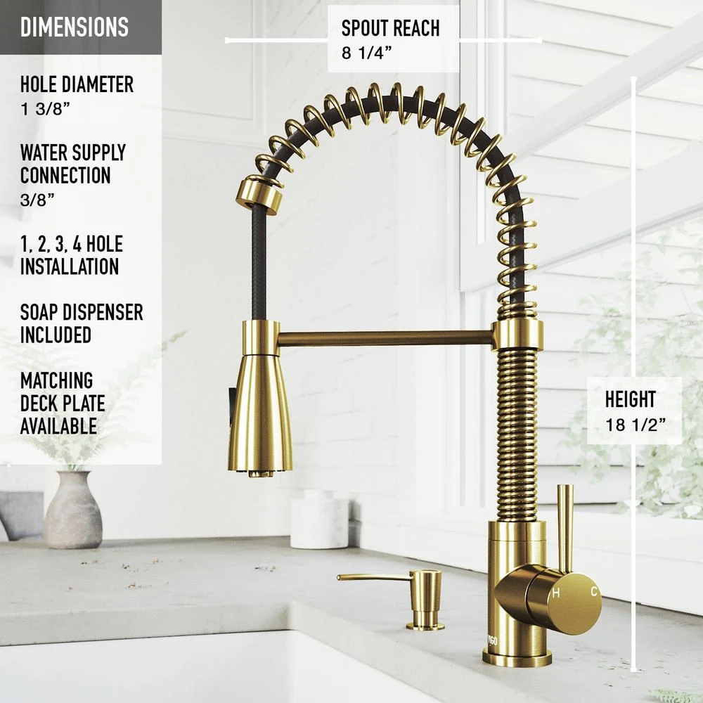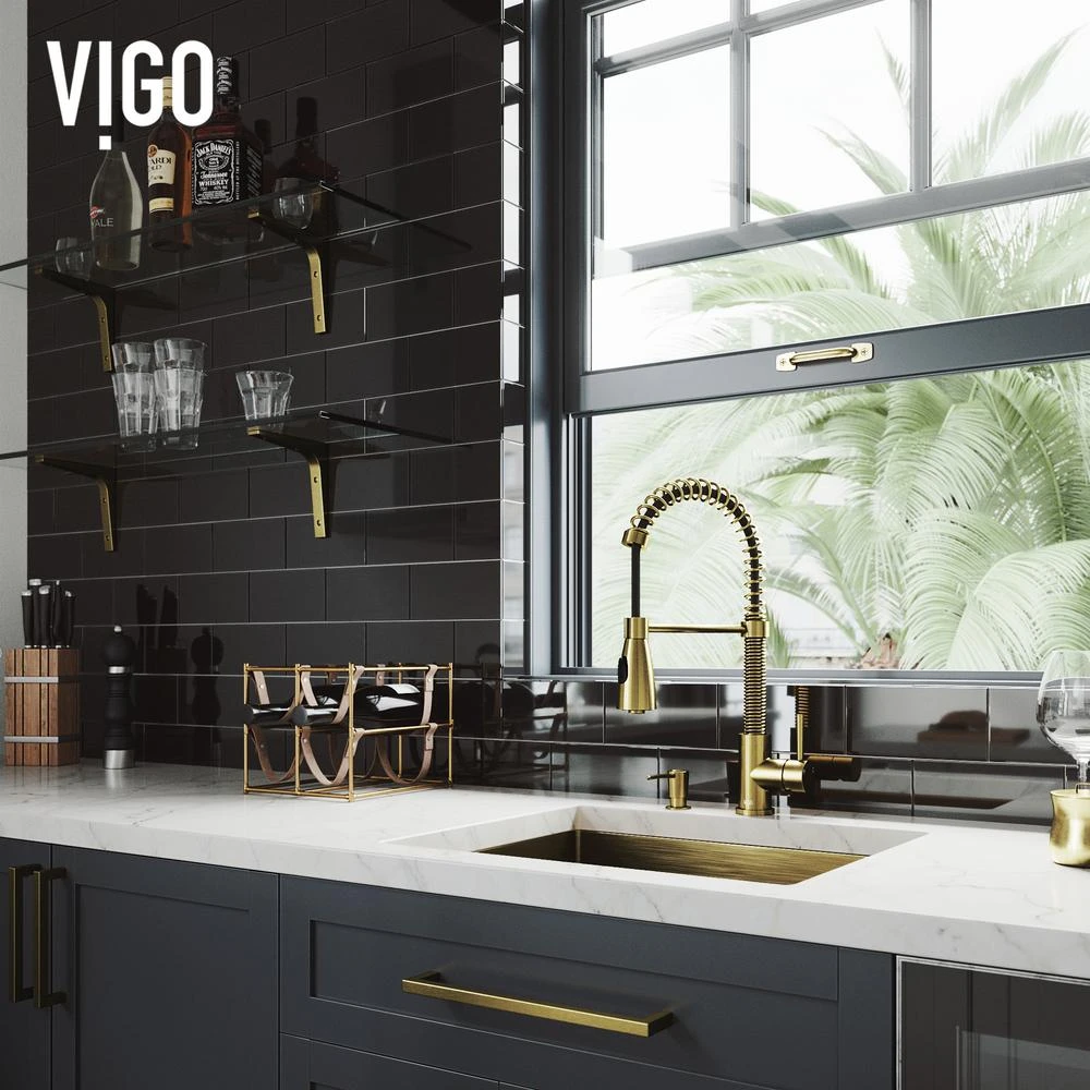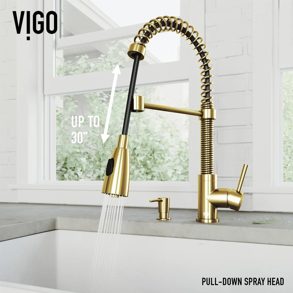 Engineering excellence meets creative hardware in the VIGO Brant Pull-Down Spray Kitchen Faucet and Soap Dispenser. The dual-function, pull-down spray head allows for either a powerful spray or an aerated flow and extends up to 30 in. with 360° swivel capabilities. The faucet is made from solid brass for top of the line construction and durability. High-end in every regard, this model comes complete with an in-counter soap dispenser that can refill up to 10 oz. of hand soap, dish soap, or hand lotion.