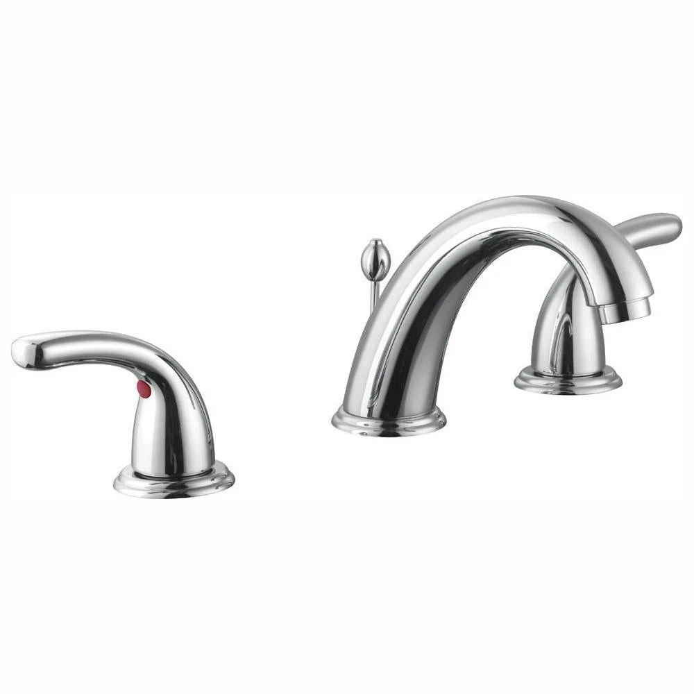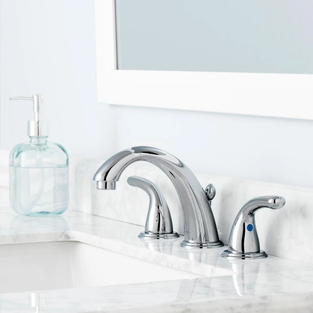 The Builders Widespread 2-Handle High-Arc Bathroom Faucet from Glacier Bay in Chrome finish offers an attractive curved design with smooth, soft lines. WaterSense certified, this efficient faucet features a 1.2 GPM flow rate to help reduce water use and ceramic disc cartridges to prevent drips. Easy to use with dual lever handles and a high-arc spout, it is finished in gleaming chrome. This Faucet features the Glacier Bay exclusive ClickInstall drain for quick and simple installation. Pair with other pieces from the Builders collection to create a stylish theme throughout your bathroom.