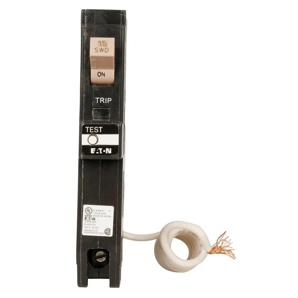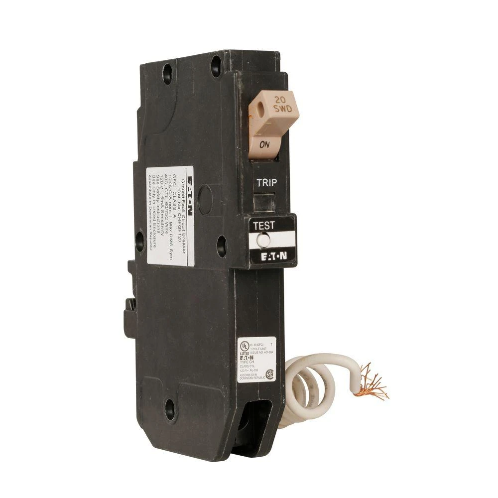 Eaton’s CH ground fault current interrupters (GFCIs) are 3/4 in. wide and provide superior safety over a standard electrical outlet in areas where electricity may come into contact with water. GFCIs are required in any application near water such as kitchen countertops, bathrooms, swimming pools, hot tubs, and outdoor receptacles. They immediately break the circuit when electrical current leakage is detected, reducing the risk of shock and electrocution. This circuit breaker periodically runs a self-test diagnostic and complies UL 943, Fourth Edition.
