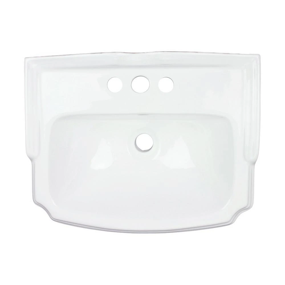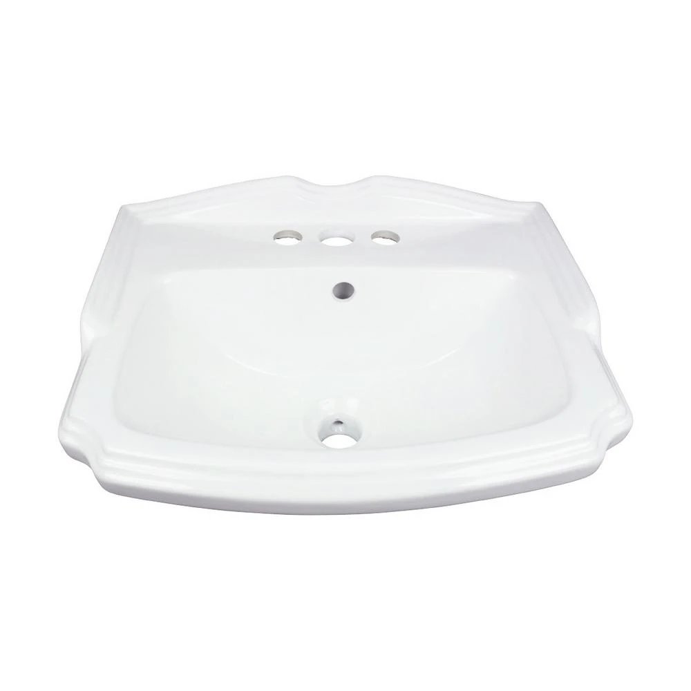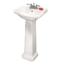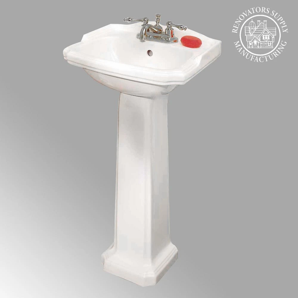 The Cloakroom pedestal sink from Renovator’s Supply features space-saving size combined with traditional American design influences Features: The Cloakroom is a gorgeous pedestal sink. Open-back pedestal sinks hide pipes and make installation a breeze. Constructed from gorgeous Porcelain for durability and easy cleanup. Reno-Gloss finish protects from scratches and stains. Authentic Renovator’s Supply logo guarantees better quality than the knockoffs. Dimensions: Overall 33 in. High x 19 in. Wide x 15 in. projection Hardware: 4 in. Centerset Faucet Holes Other Details: Installation Style: Freestanding, Design Inspirations: Modern bathroom appointments. What’s Included: One (1) Cloakroom Porcelain Pedestal Sink.