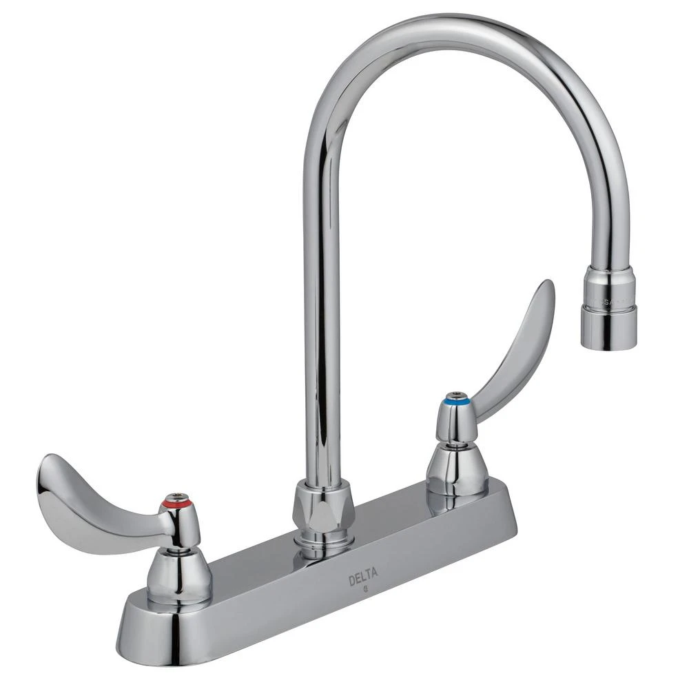 Featuring a high-arc spout and a metal hold-down package, the ADA-compliant Delta Commercial 2-Handle Kitchen Faucet in Chrome with Lever Blade Handles can make a great fit for a variety of Commercial applications. The easy-to-use design of this kitchen faucet features lever blade handles with sanitary hoods. You can install with confidence, knowing that Delta faucets are backed by our Lifetime Limited Warranty.