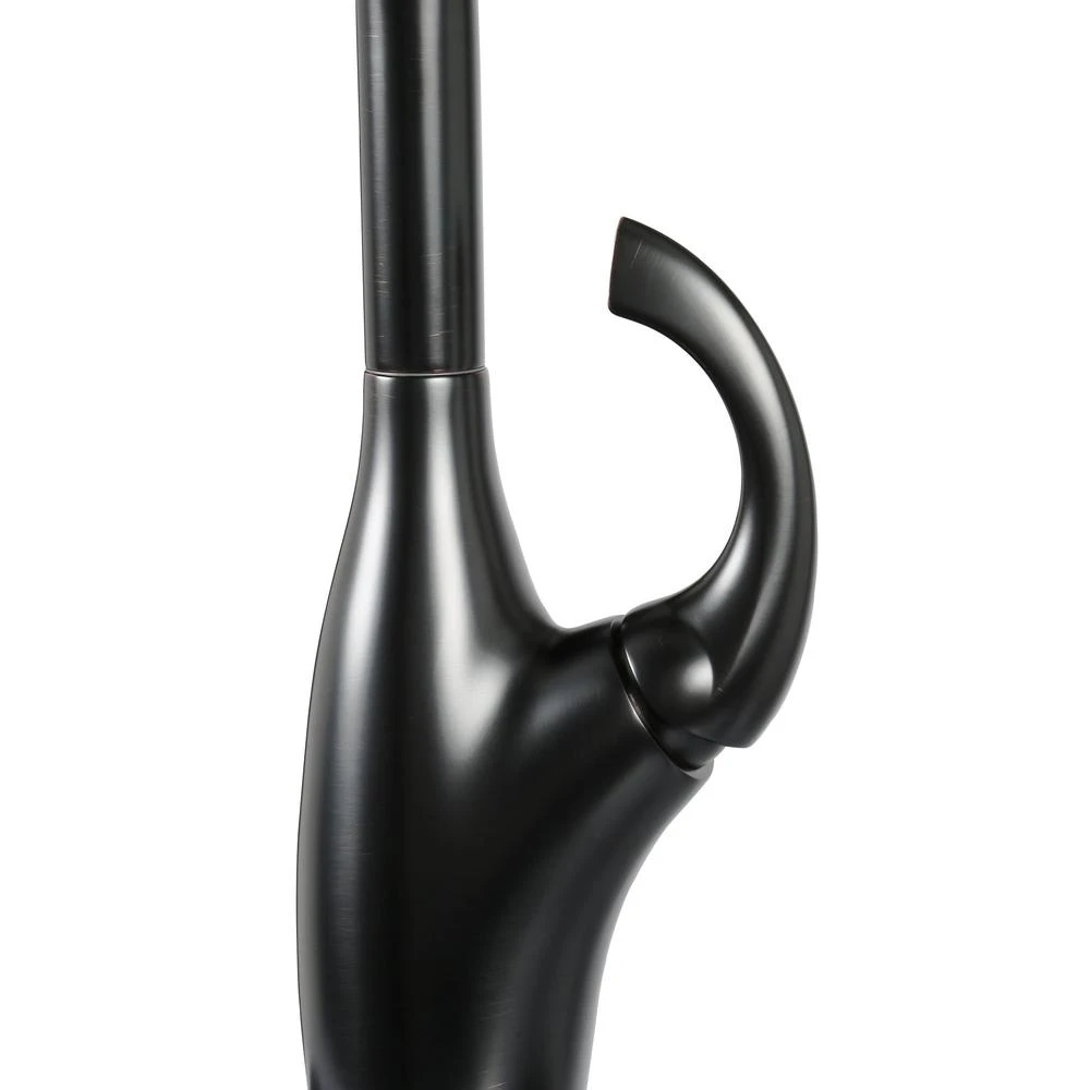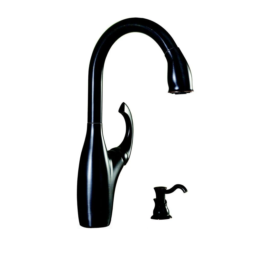 This Glacier Bay Single-Handle Pull-Down Sprayer Kitchen Faucet with Soap Dispenser in Mediterranean Bronze features a transitional style with a smooth and simple curved design. It complements a wide range of kitchen decor. This faucet is easy to use with single water control and a spout with a high arc for ample sink clearance. Its pull-down sprayer offers plenty of reach for cleaning the sink, rinsing dishes or filling pots and pans. A ceramic disc enables drip-free performance and is easy to install.