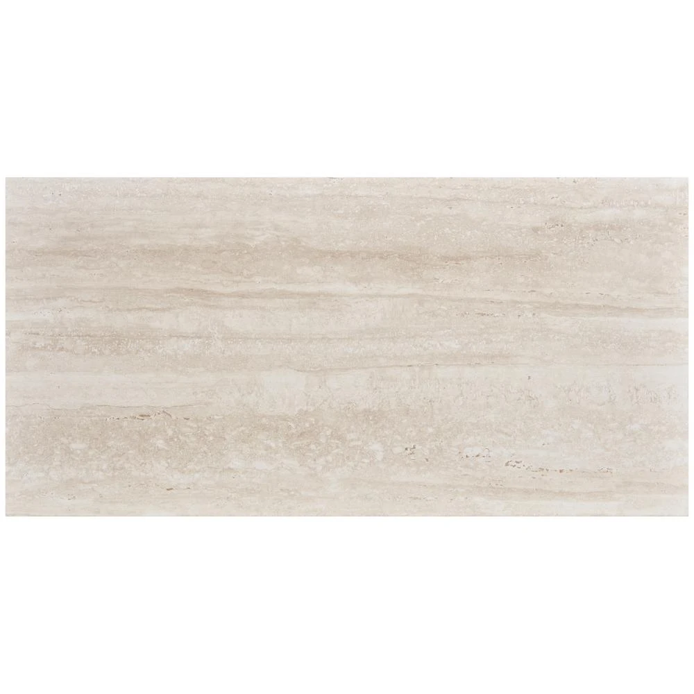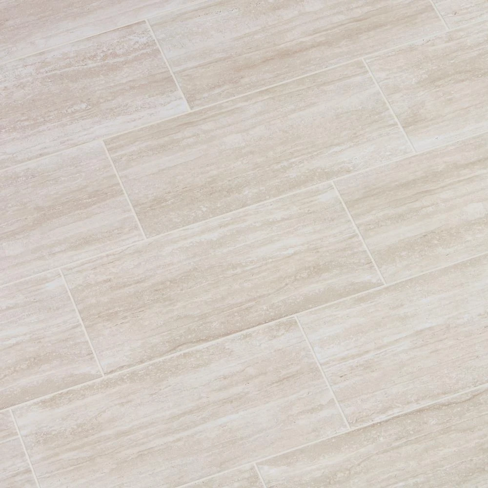 Elevate your space with the Glendale 12 in. x 24 in. Ivory porcelain floor and wall tile by Daltile. This white travertine look tile showcases beautiful veining and has a linear pattern. Use it in kitchens, bathrooms and laundry rooms for a classic look. As beautiful as it is durable, this porcelain tile is waterproof, scratch- resistant, and stain proof.