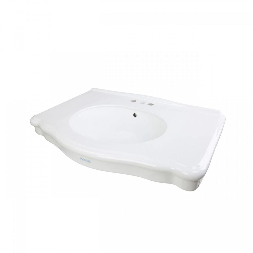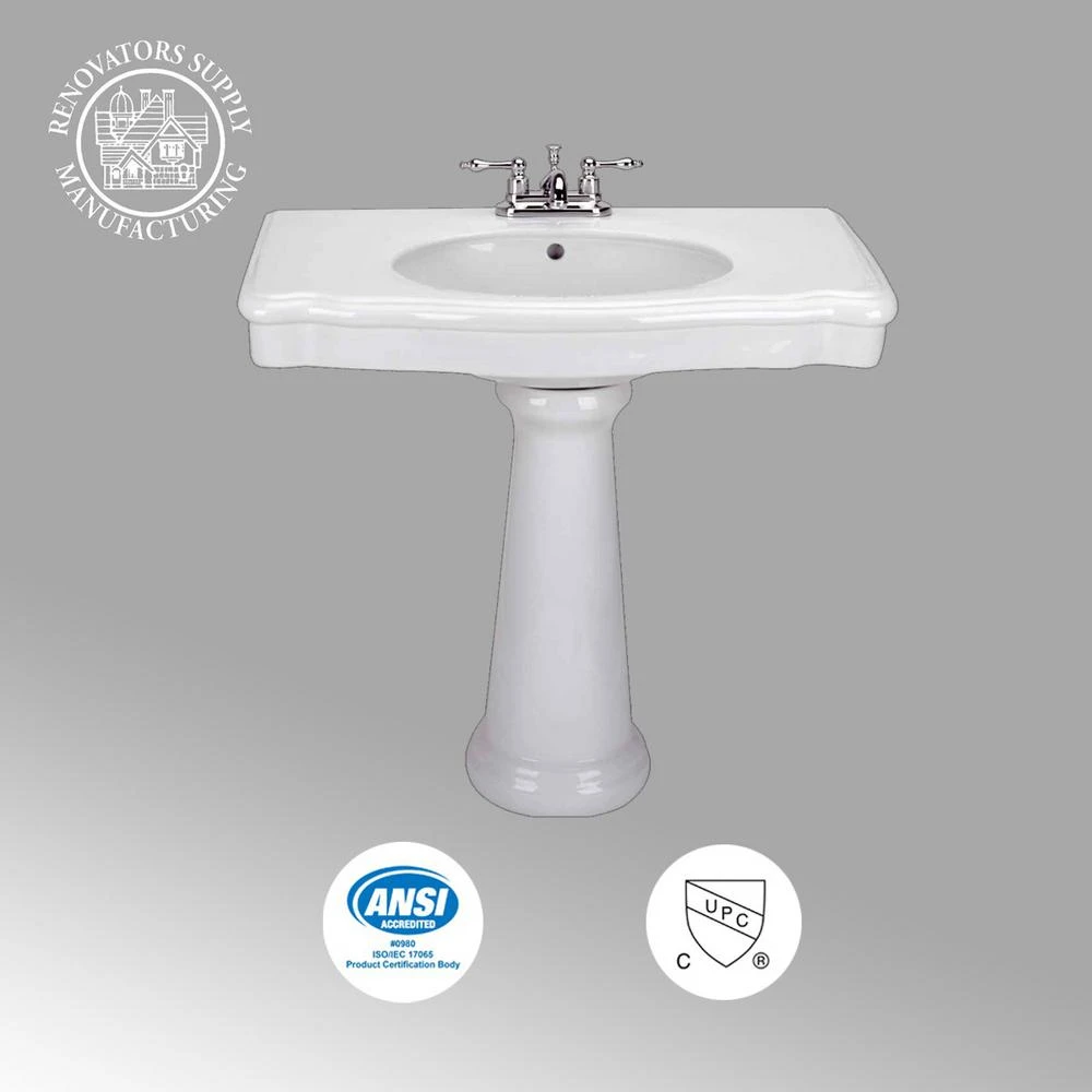 Classic Vintage Pedestal Sink that possesses all the grace of a oval pedestal sink and all the utility of a console sink. This Vintage Style Pedestal Sink brings new elegance and vintage style to any bathroom. This bathroom sink has an overflow and accepts drains with overflows made to fit 1-3/4 in. drian holes. Accepts 4 in. centerset faucet. Measures 33-1/8 in. H x 34-1/2 in. W x 22-3/8 in. Projection. Pedestal Sink that would add that special touch to any bathroom. cUPC and ANSI Compliant. Select your Pedestal Sinks here today. Item ID 12786