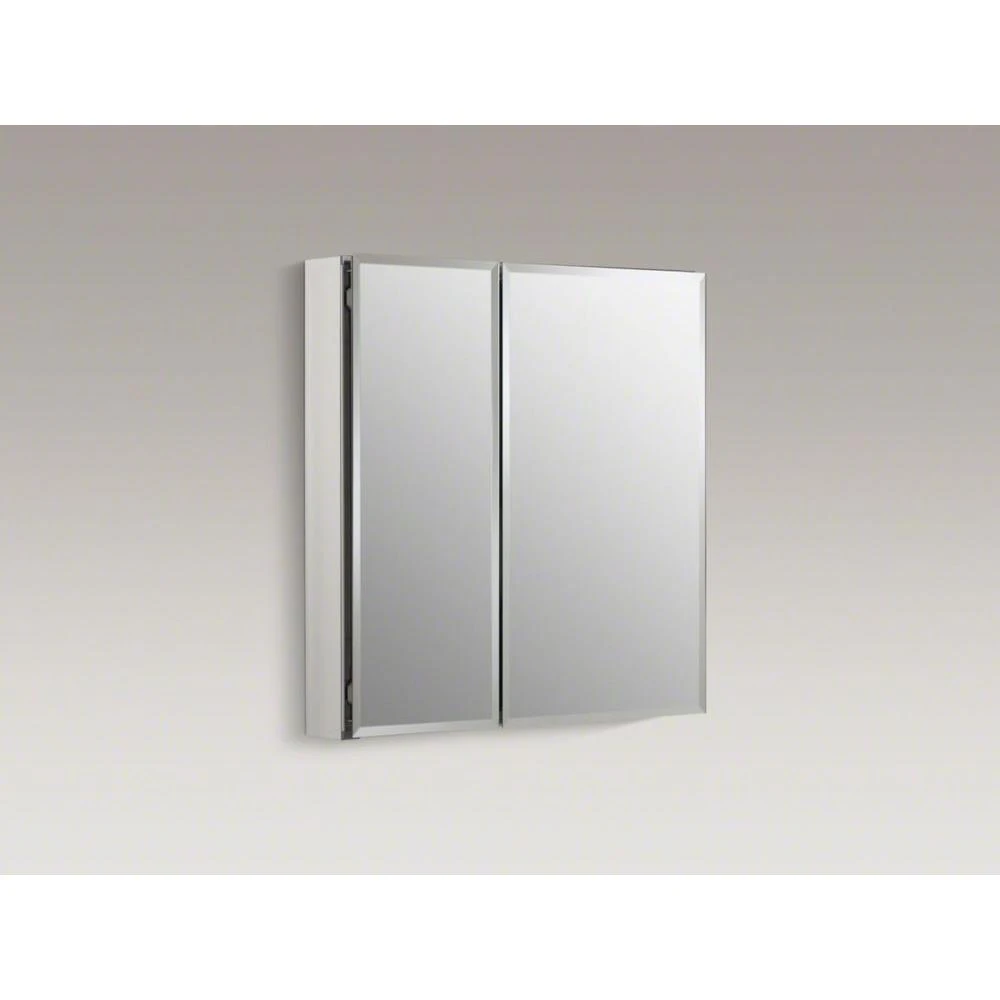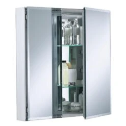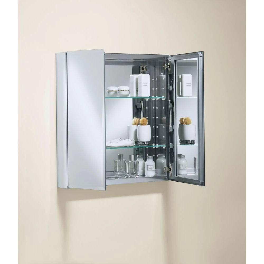 With a sleek mirrored surface inside and outside, this 25 in. frameless double-door cabinet brings versatility to any bathroom in your home. The two mirrors on the front doors have a 1/2 in. bevel and appear as one larger mirror for a design that integrates easily into any bath or powder room. Interior adjustable glass shelves hold all your toiletries and bath items, placing them within easy reach. An anodized aluminum construction offers a long-lasting, chip-free finish.