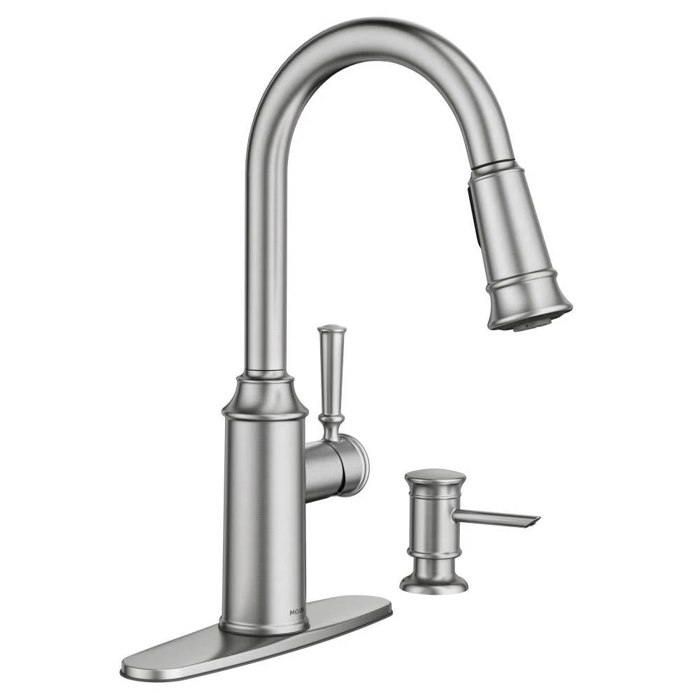 The Glenshire collection’s modern streamlining of classic design trends creates a timeless blend of old and new that’s never out of style. Showcasing MOEN’s top innovative features, the Glenshire Pull-Down Sprayer Kitchen Faucet utilizes Reflex technology, engineered specifically for pull-out and pull-down movement by undocking easily, moving with you and retracting effortlessly when you’re done. The Reflex system was developed in a kitchen just like yours, by observing peoples’ routines to create an effortless experience that simplifies daily tasks. Also designed with Powerclean technology that delivers 50% more spray power, Glenshire ensures efficient washing with less effort. For added convenience, MOEN’s exclusive Spot Resist finish resists fingerprints and water spots to maintain its original brilliance and easily wipes clean, ensuring the beautiful stainless appearance will continue to shine over time.