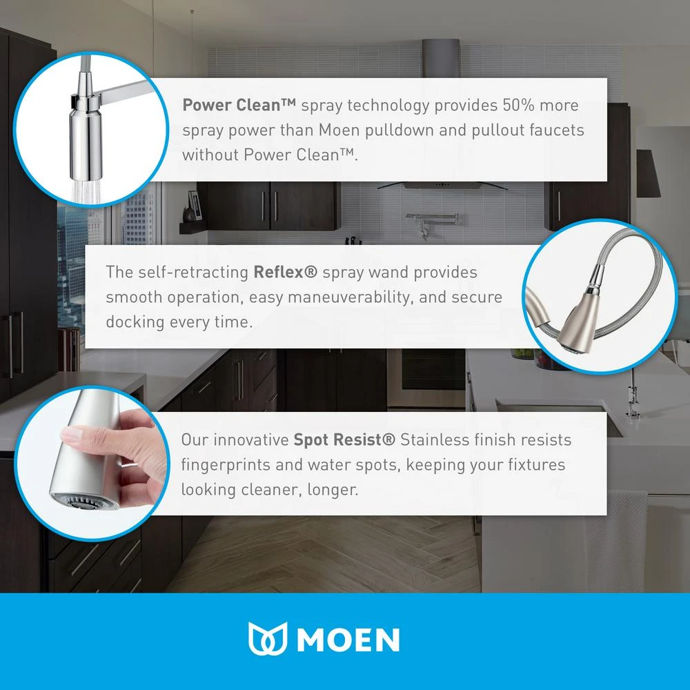 - Power Clean spray technology provides 50% more spray power versus most MOEN pulldown and pullout faucets without the Power Clean technology