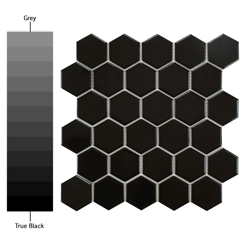 This Merola Tile Metro Hex 2 in. Glossy Black 10-1/8″ x 12-5/8″ x 7 mm Porcelain Mosaic Tile is reminiscent of Victorian-era tile mosaics, but with a modern black finish. It features a smooth, high-gloss finish for a clean, stylish look perfect for any setting whether modern construction or historical renovations. Easy to clean and durable, these tiles are suitable primarily for interior residential applications in most areas of the home. Being impervious to water, these tiles are ideal for bathrooms and backsplashes and even offer frost resistance for some exterior work. If pairing with other products in our Metro Hex series, please consider that all formats and thicknesses may not be the same.