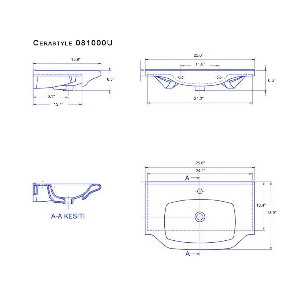 Classic-style 25.6 in. wall mounted or self-rimming bathroom sink with 1 pre-drilled faucet hole and included overflow. This beautiful, classic sink is made out of high quality ceramic, and designed by high-end, and well known Turkish brand CeraStyle.