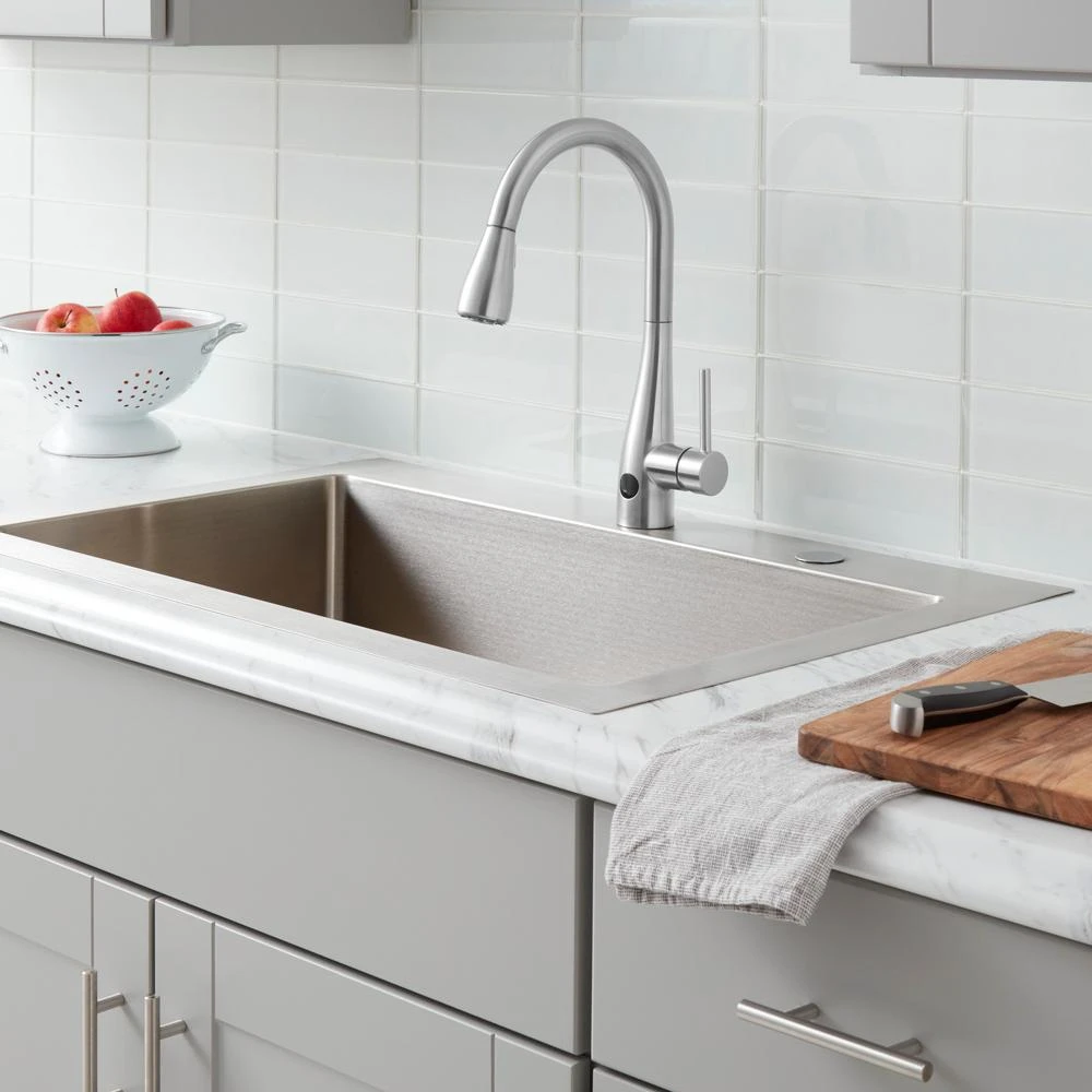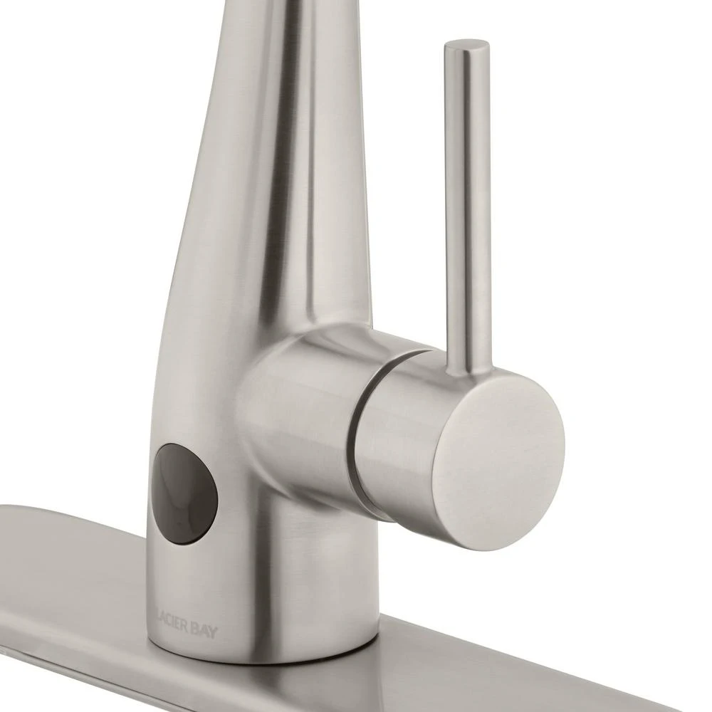 This Glacier Bay Nottely Single-Handle Pull-Down Sprayer Kitchen Faucet boasts an intuitive, battery-powered sensor that enables hands-free use to help reduce spreading bacteria. This innovative kitchen faucet is equipped with the powerful TurboSpray setting for your toughest cleaning tasks. The exclusive feature provides focused water columns with 30 percent more power than standard pull-down faucets. This single-handle kitchen faucet enables easy and precise water temperature control, while providing a 1.8 GPM flow rate for outstanding water flow. Its ceramic disc cartridge ensures drip-free performance. Get ample kitchen space from its high-arc spout and a modern look with its stainless steel finish and curved minimalist design. Installation is quick and easy with this kitchen faucet’s FastMount system.