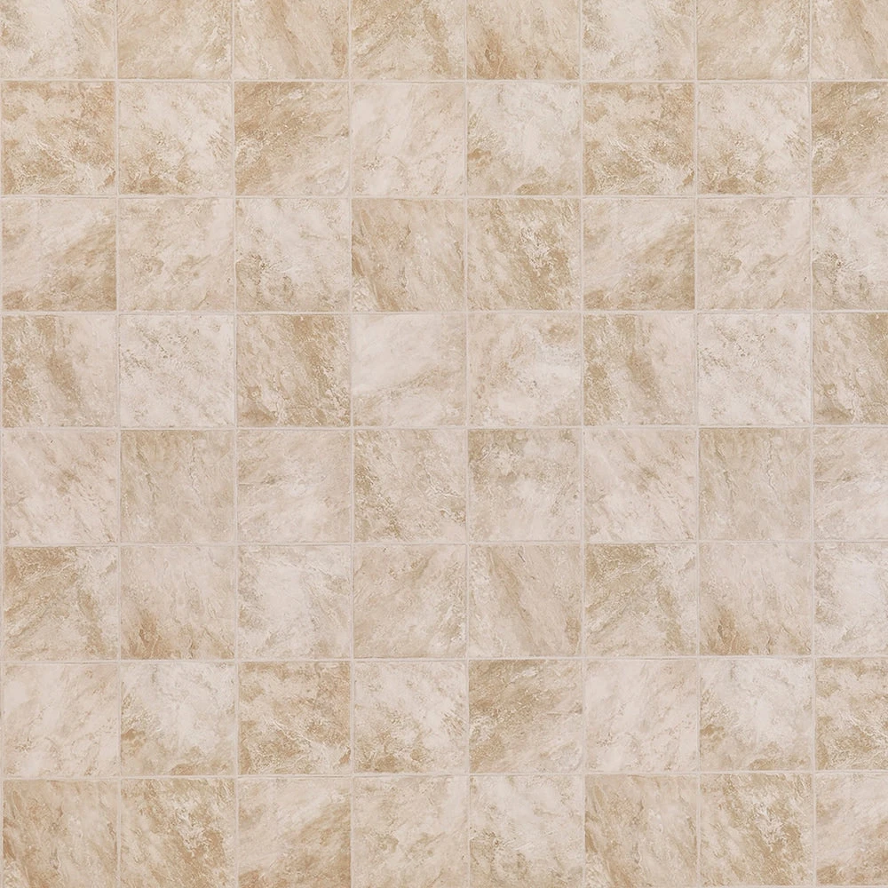 This tile-look vinyl features a blend of pinks, tans and whites for a lighter, softer feeling