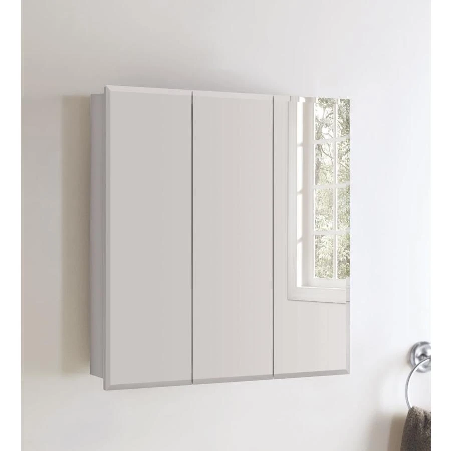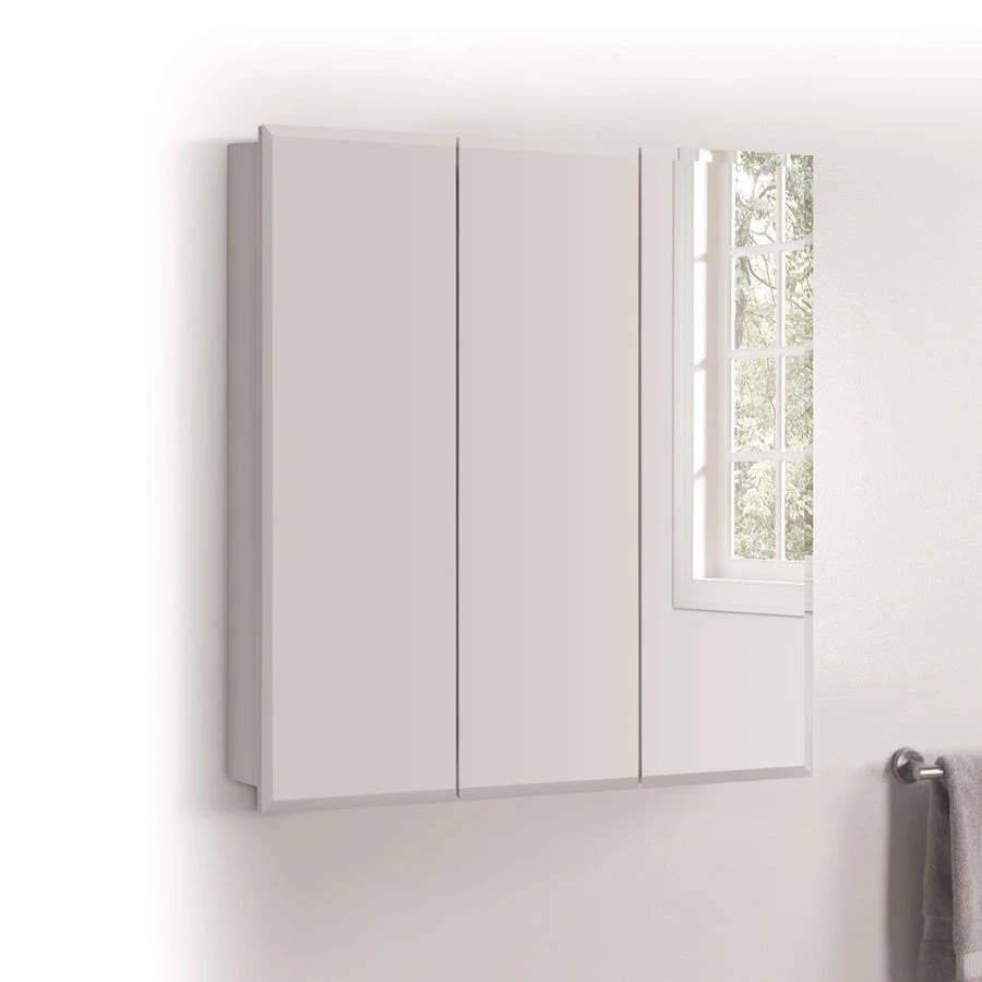 Features 2 adjustable shelves for flexible storage options and a beveled Tri-View mirrored door with adjustable concealed hinges
