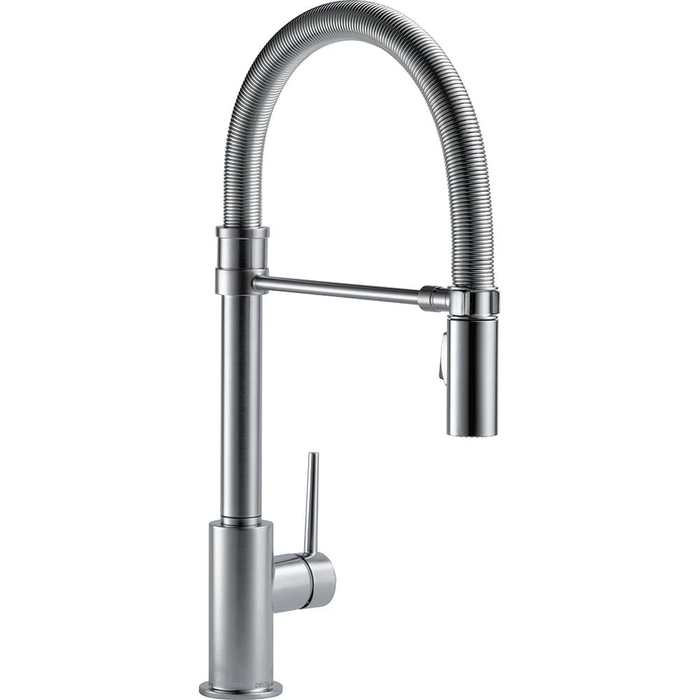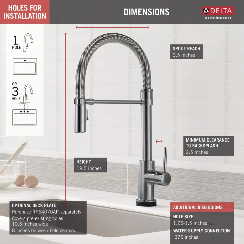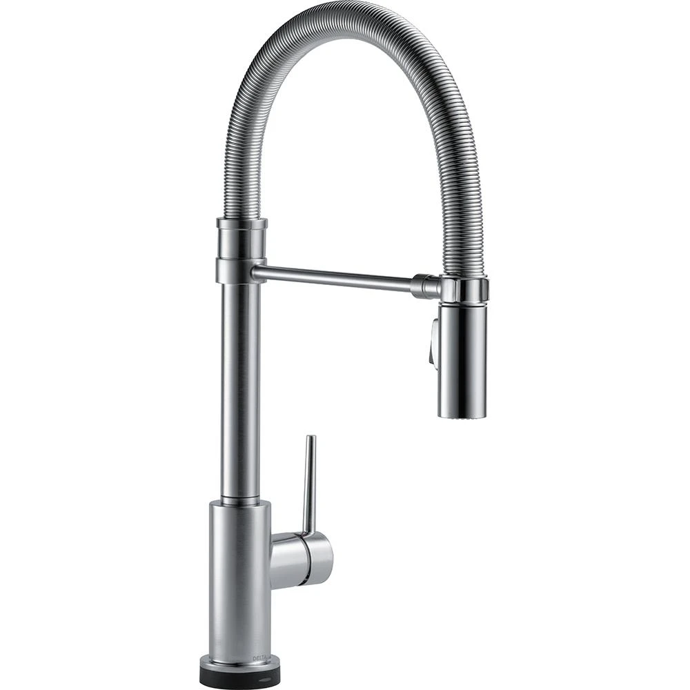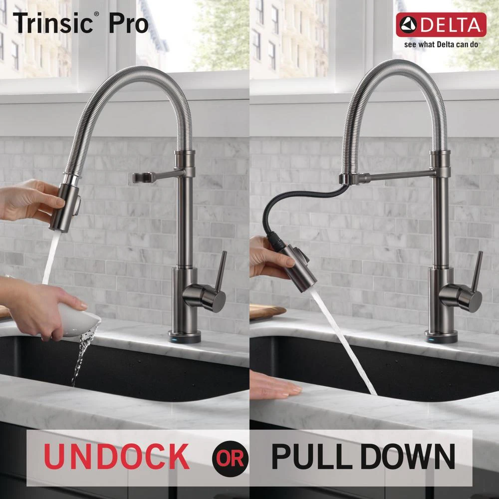 The unique integrated pull-down wand feature lends the Trinsic Pro kitchen faucet collection its characteristic style as well as unrivaled functionality. The Trinsic Pro faucet puts control in the hands of the user with the flexible, spring-design undocking spout, which can be easily disconnected then magnetically re-docked for free range of motion. When docked, the Trinsic Pro faucet still operates as a true pull-down faucet with MagnaTite Docking. Thoughtfully designed to make kitchen tasks easier, Touch2O Technology allows you to turn the faucet on and off with just a touch anywhere on the faucet’s spout or handle. Designed for precise, responsive control every time, no matter where you touch. You can easily control and change the water temperature above the deck using the faucet handle. TempSense Technology measures the water temperature in the faucet. The LED light at the base of the faucet changes from blue to magenta to red depending upon the temperature of the water to let you know when the water temperature is right for you. A/C adapter EP73954 is available to purchase separately as an option to avoid changing batteries. Even if the adapter is used, batteries are still recommended as a back-up if power goes out. Delta’s exclusive DIAMOND Seal Technology uses a valve with a tough diamond coating. InnoFlex PEX waterways keep water inside the faucet out of contact with potential metal contaminants.