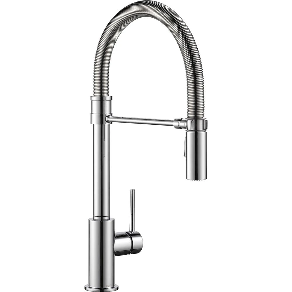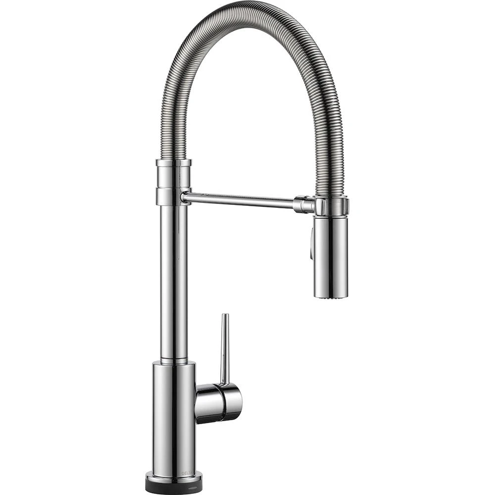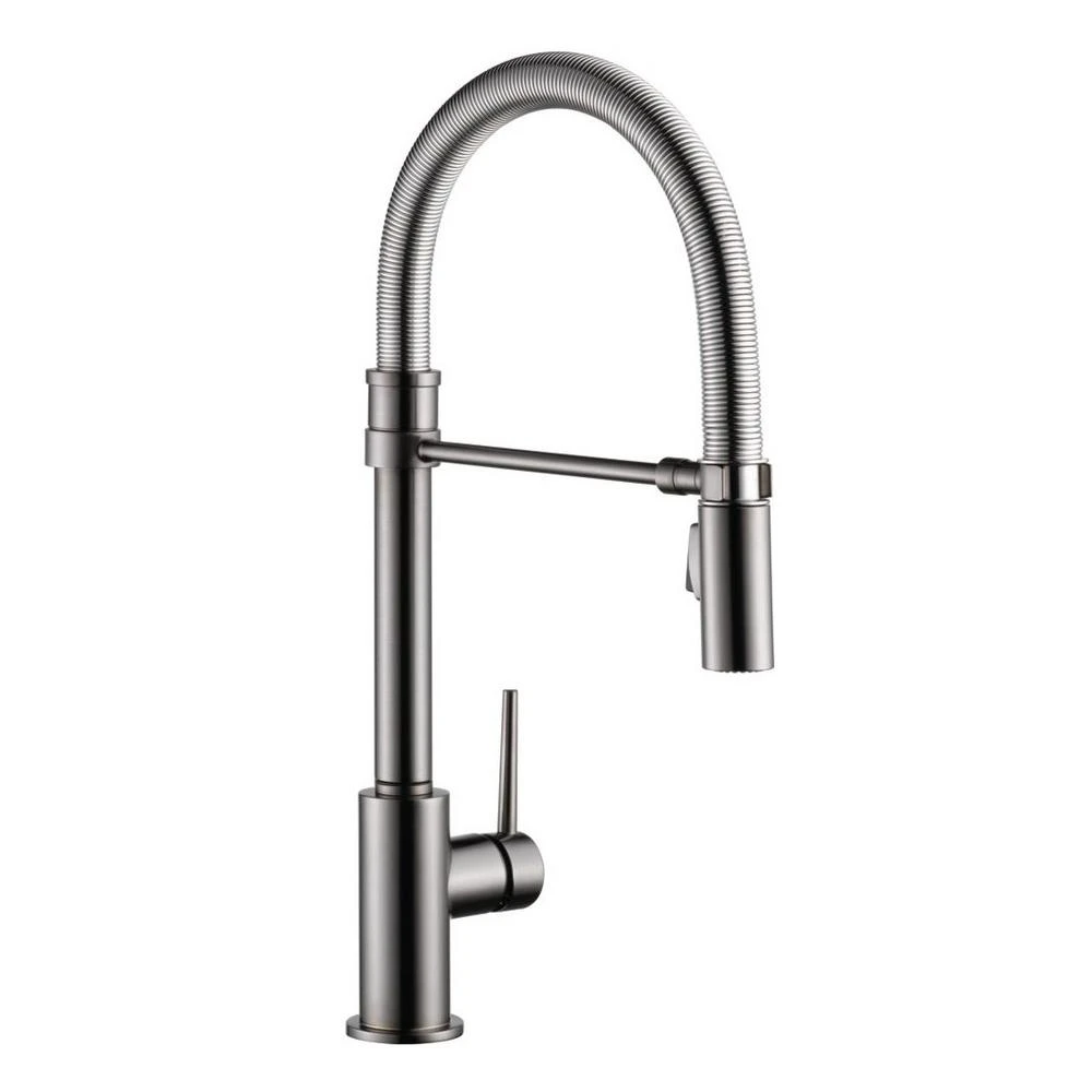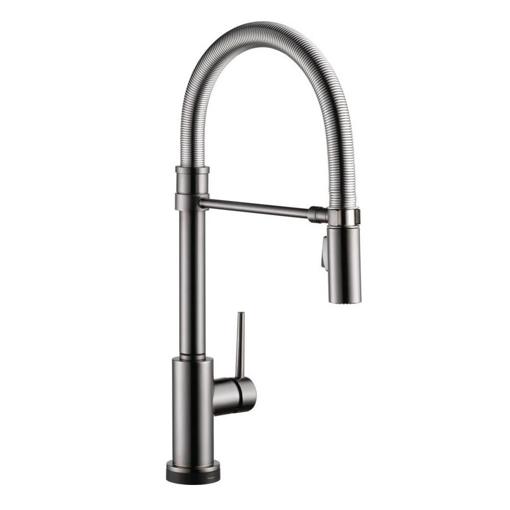 The unique integrated pull-down wand feature lends the Trinsic Pro kitchen faucet collection its characteristic style as well as unrivaled functionality. The Trinsic Pro faucet puts control in the hands of the user with the flexible, spring-design undocking spout, which can be easily disconnected then magnetically re-docked for free range of motion. When docked, the Trinsic Pro faucet still operates as a true pull-down faucet with MagnaTite Docking. Thoughtfully designed to make kitchen tasks easier, Touch2O Technology allows you to turn the faucet on and off with just a touch anywhere on the faucet’s spout or handle. Designed for precise, responsive control every time, no matter where you touch. You can easily control and change the water temperature above the deck using the faucet handle. TempSense Technology measures the water temperature in the faucet. The LED light at the base of the faucet changes from blue to magenta to red depending upon the temperature of the water to let you know when the water temperature is right for you. A/C adapter EP73954 is available to purchase separately as an option to avoid changing batteries. Even if the adapter is used, batteries are still recommended as a back-up if power goes out. Delta’s exclusive DIAMOND Seal Technology uses a valve with a tough diamond coating. InnoFlex PEX waterways keep water inside the faucet out of contact with potential metal contaminants.