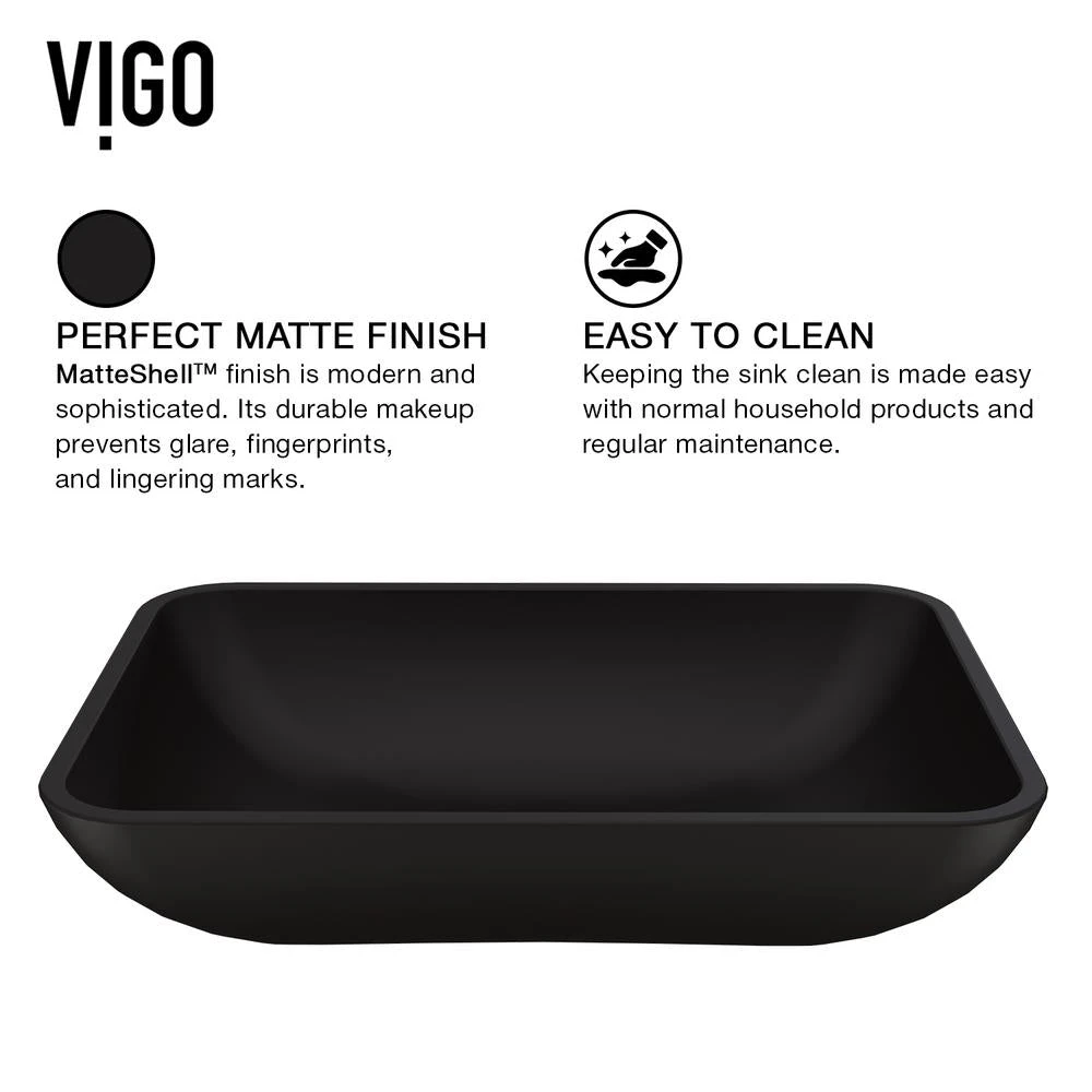 From deliberate design and pristine construction comes the VIGO Black Sottile MatteShell Vessel Bathroom Sink. Innovative and intense, MatteShell sinks bring the same excellence of classic solid tempered glass sinks and take them to the next level. The Black Sottile is deeply opaque and has an eggshell-like sheen that is rich yet subtle. Its deep ebony shade is infused into the sink itself, eliminating any risk of a chipped finish. The sink also has a fingerprint-free coating to prevent the appearance of marks. The Sottile has a soft rectangular shape with rounded edges. This design makes it easy to maintain and love in the home as a unique piece of functional art. Experience the synergy of character and style all in one with the VIGO Sottile MatteShell.