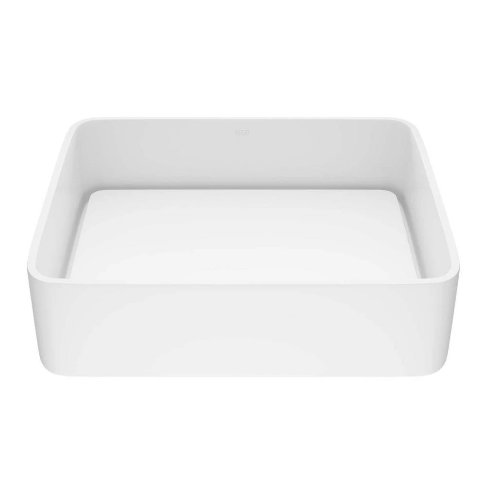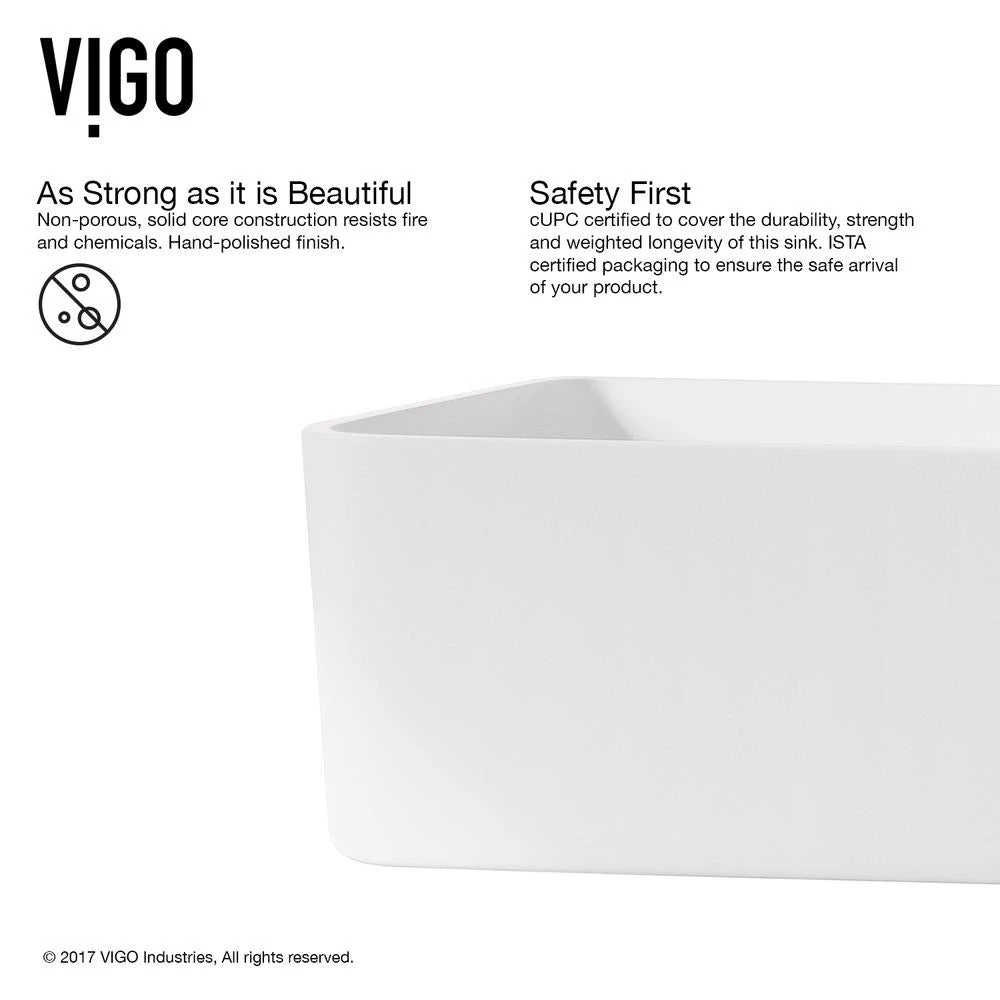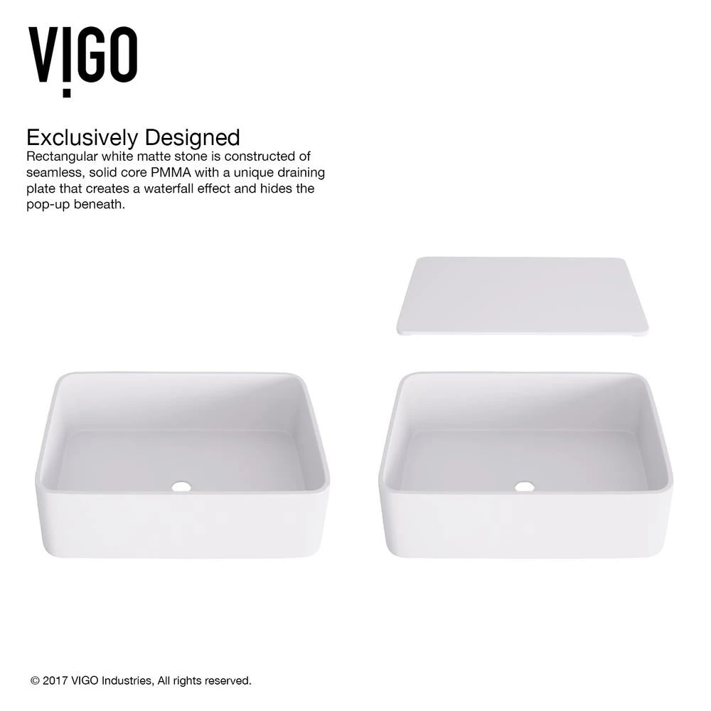 Seamless, solid core Matte StoneTM construction makes the VIGO Jasmine Matte StoneTM Vessel Bathroom Sink extremely durable. Its surface is scratch and fade resistant, and is easy to keep clean and maintain. With its rectangular design and satin-smooth matte surface, this vessel sink features a unique drain cover plate, creating a waterfall effect. This plate also discreetly hides the pop-up drain beneath it to complete a clean, elegant overall design.